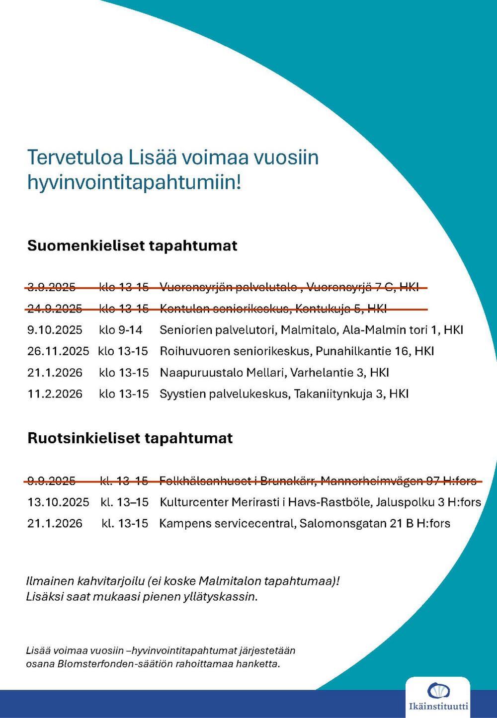 Ikäinstituutti järjestää Lisää voimaa vuosiin –hyvinvointitapahtumia eri puolilla Helsinkiä.