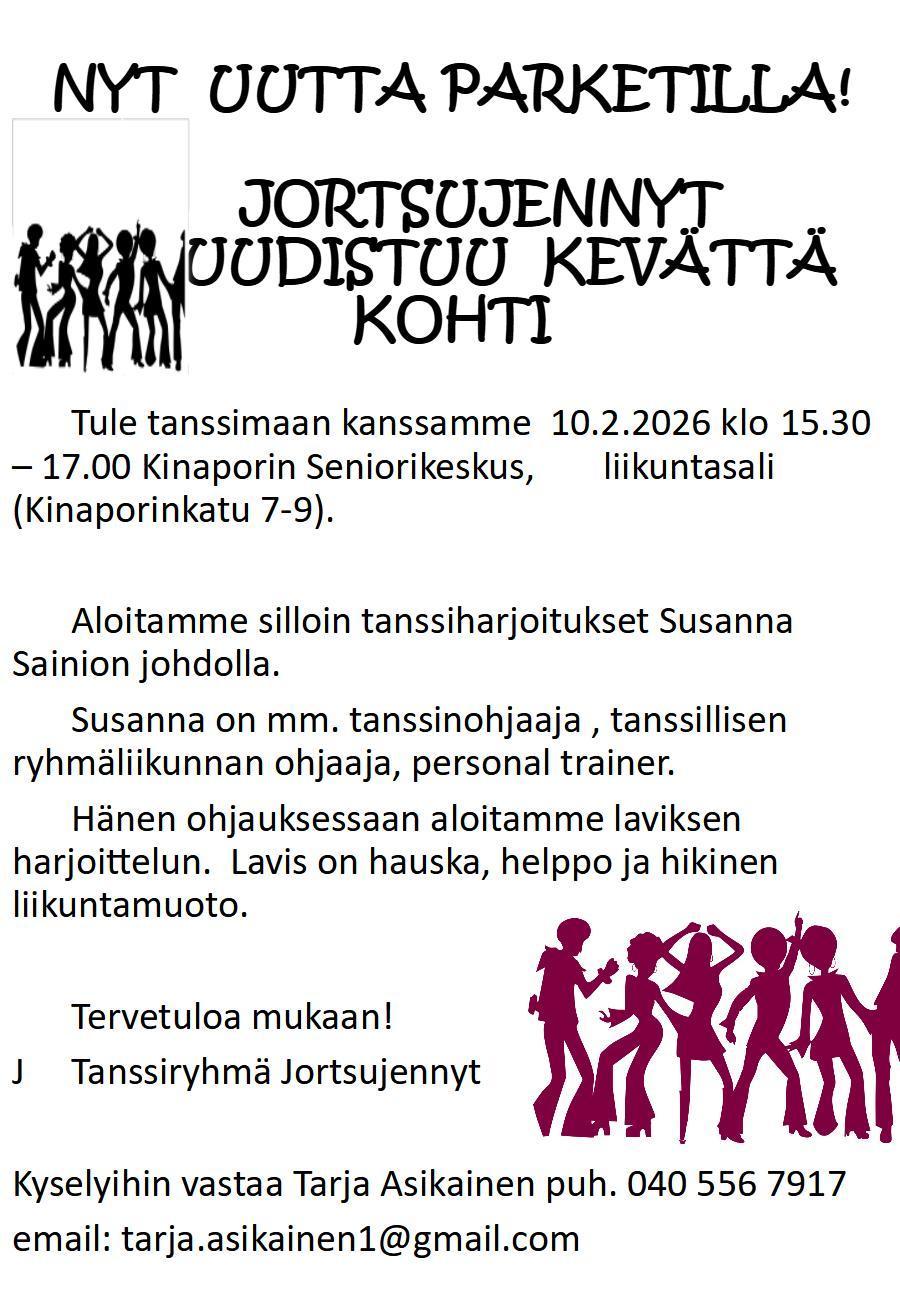 Jortsujennyt-tanssiryhmä harjoittelee Kinaporin seniorikeskuksen liikuntasalissa klo 15:30–17:00 joka tiistai: 13.1.–26.5.2026.