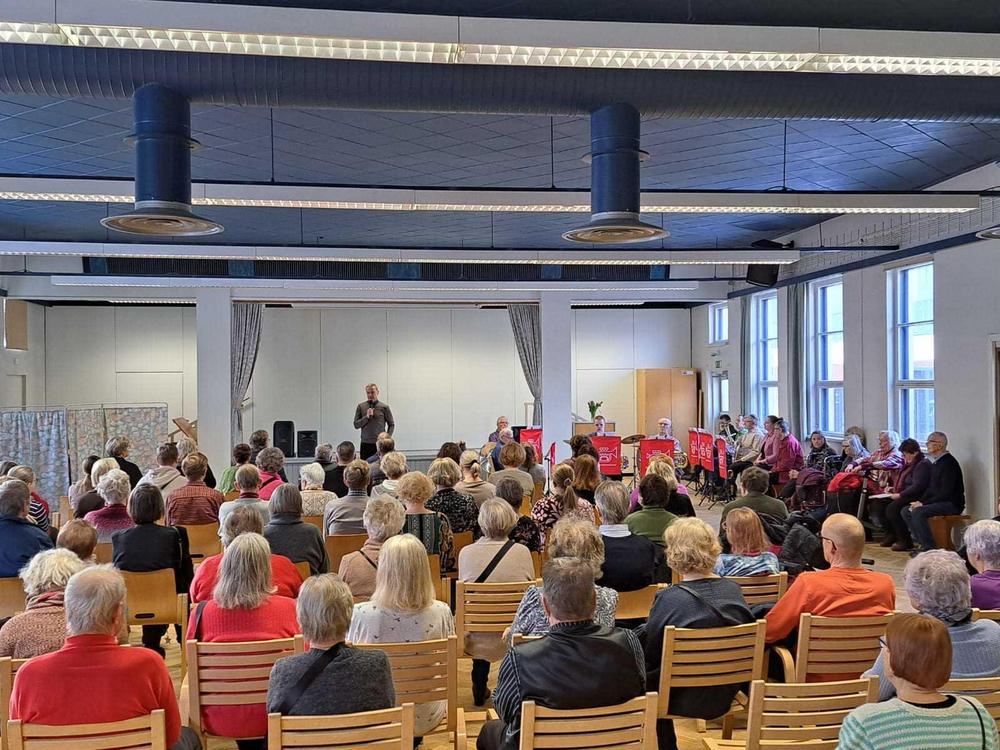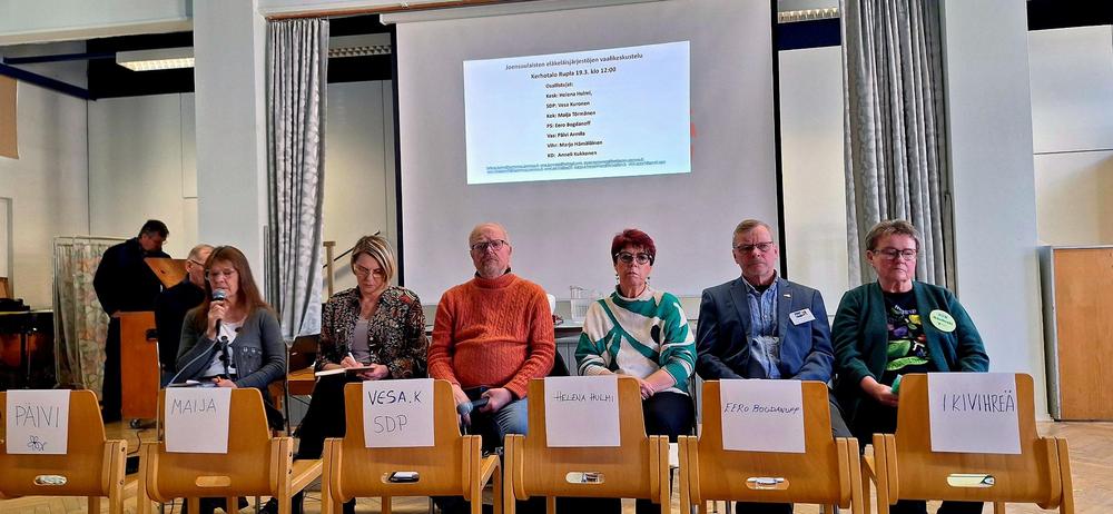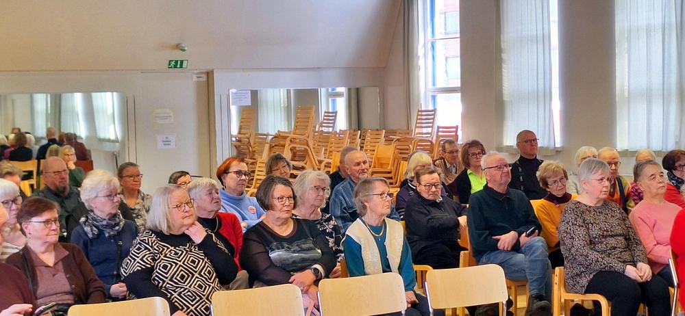 Sali oli lähes täysi, 75-80 kanssakulkijaa. Keskustelijoita kuusi, KD:n edustaja estynyt. Pyysin keskustelijoiksi erilaisia ikäihmisiä kaupungin eri puolilta ja myös yli kuntarajan, huom. aluevaalit. Keskustelu oli kokonaisuutena hyvähenkinen.