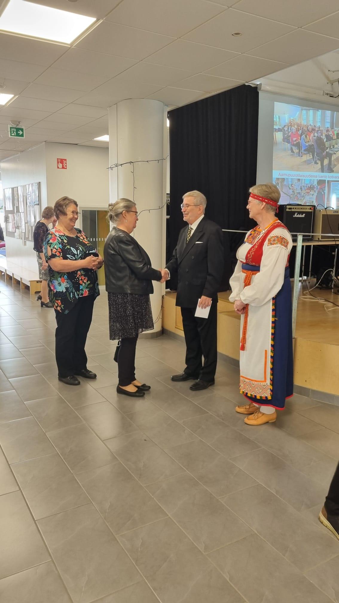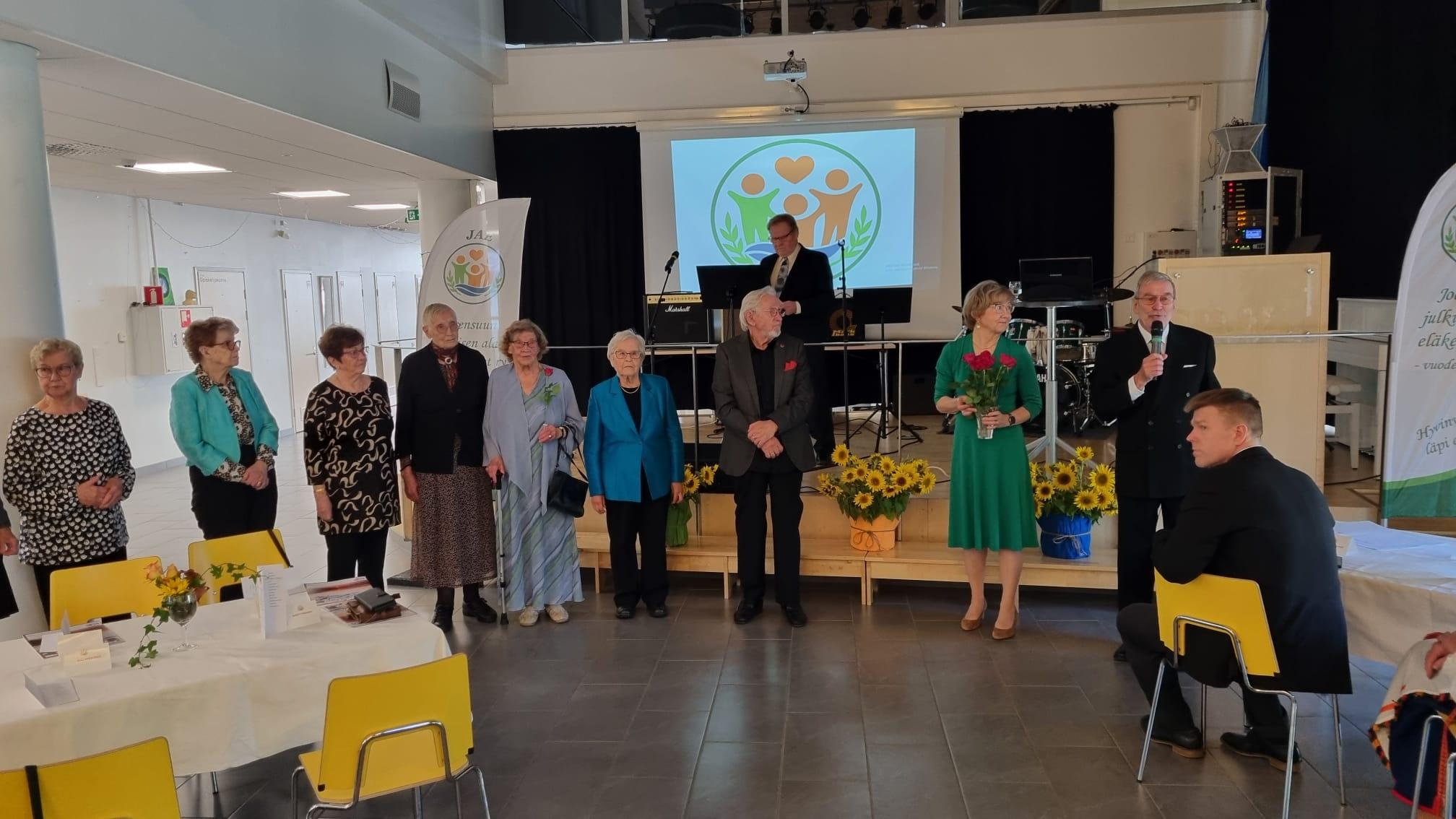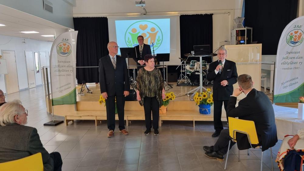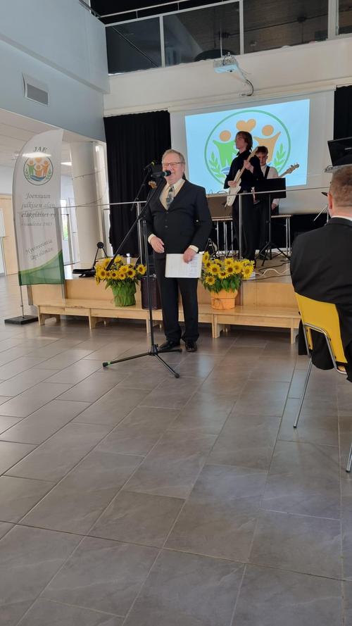 JAE 40-vuottaVietimme JAE:n 40-vuotisjuhlia viikko sitten. Hieno tapahtuma, johon oli saapunut 90 osallistujaa. Kahvittelutilaisuutta viihdytti Janne Penttinen harmonikkamusiikilla. Lukiolaisten bändi esitti hienosti kappaleet Lintu ja Lapsi, Olen suomalainen ja Ranskalaiset korot. Juhlapuhujamme maakuntajohtaja Markus Hirvonen loihti meille hienoja "kuvia" ja uskoa Pohjois-Karjalan tulevaisuudesta, meidän on hyvä ja turvallista elää täällä. Puheenjohtaja Ari Tielinen kertoi yhdistyksemme historiasta.Sitten muistimme kukkatervehdyksellä 20 vuotta yhdistyksessä olleita jäseniä. Logokilpailun voittajat Matti Immonen ja Eija Karjalainen palkittiin ja kukitettiin. Juhlan lopuksi lauloimme yhdessä Karjalaisten laulun. Tilaisuuden juontajana oli Seppo Hämäläinen.Kiitos juhlan järjestäjille ja kaikille juhlaan osallistuneille. Kauniit kukka-asetelmat Merja Leppänen ja Vuokko Tahvanainen. Kuvat: Tenho Kinnunen |