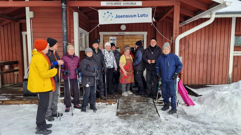 Pirteä keväinen pakkassää suosi meidän sauvakävelijöitä. Ensin piti tankata kunnon munkkikahveilla ja stten lähdettiin kävelemään. Lykynlammen kahvio on kuuluisa munkeistaan, siellä käydään kahveilla kauempaakin. Kahvio on tällä hetkellä lopetusuhan alla, kun Joensuun kaupunki on myymässä hiihtomaja rakennukset. Kahvio on avoinna viimeisen kerran 16.3.2025. Toivotaan, että kahviotoiminta jatkuu vielä omistajan vaihtumisenkin jälkeen.