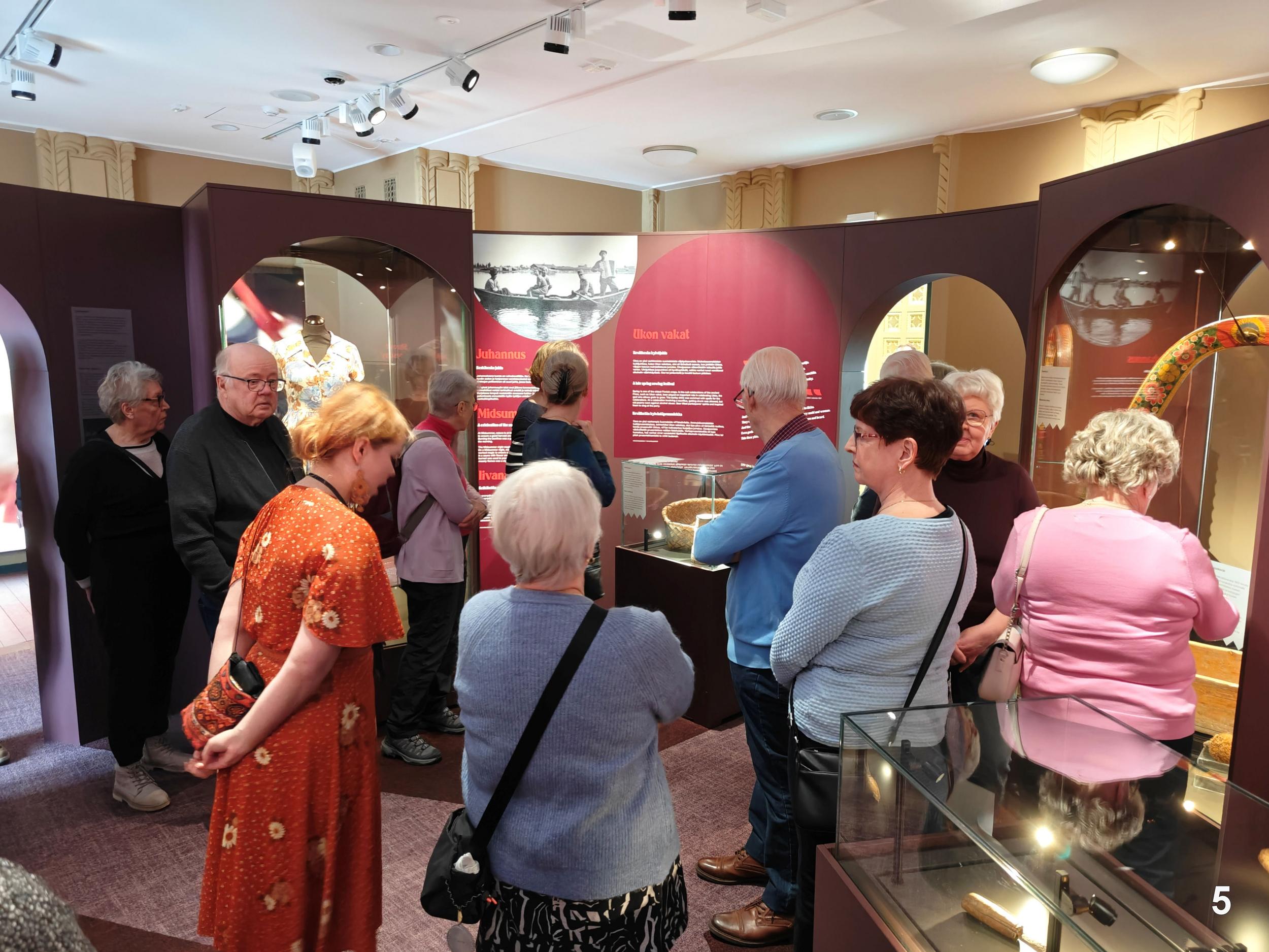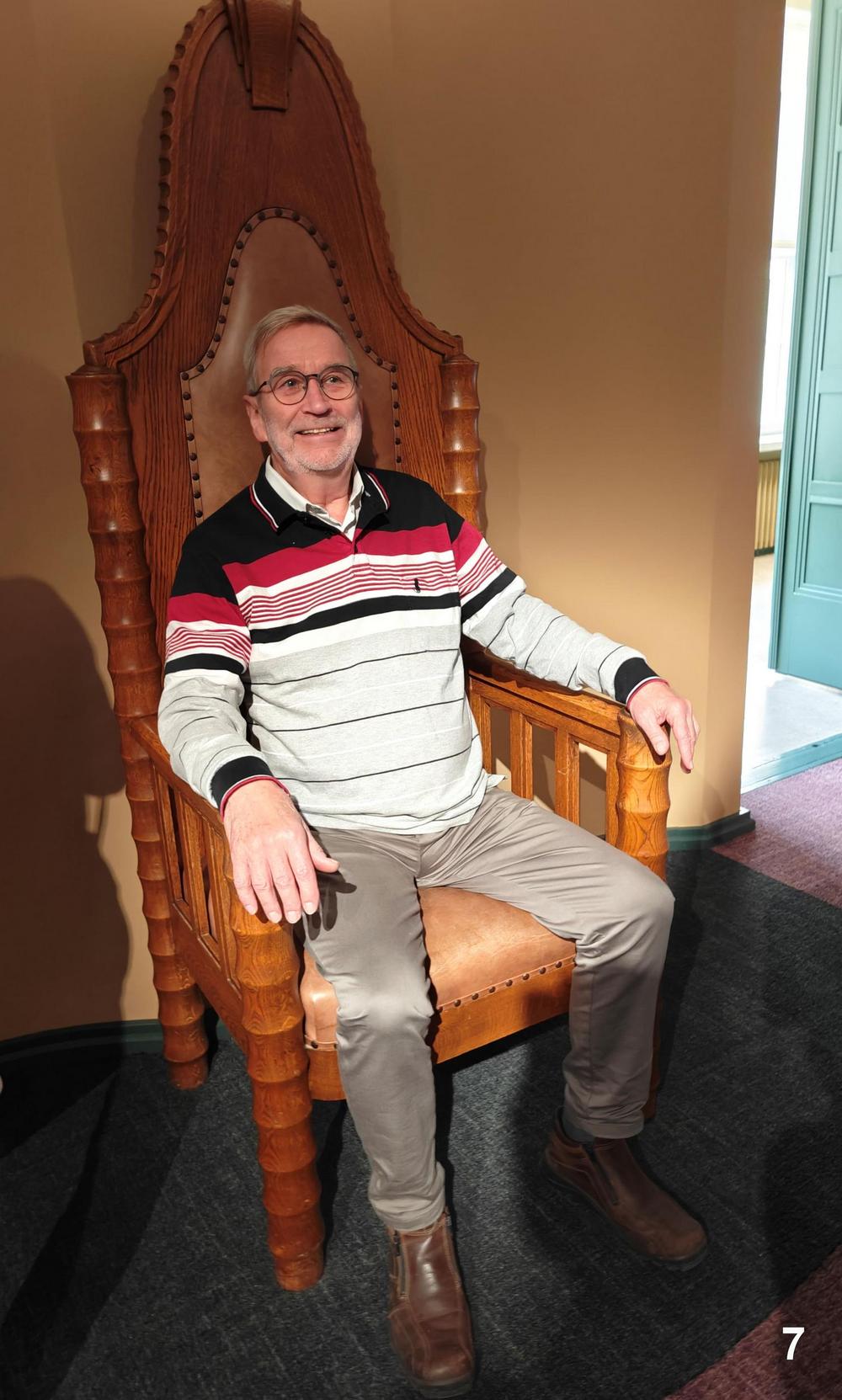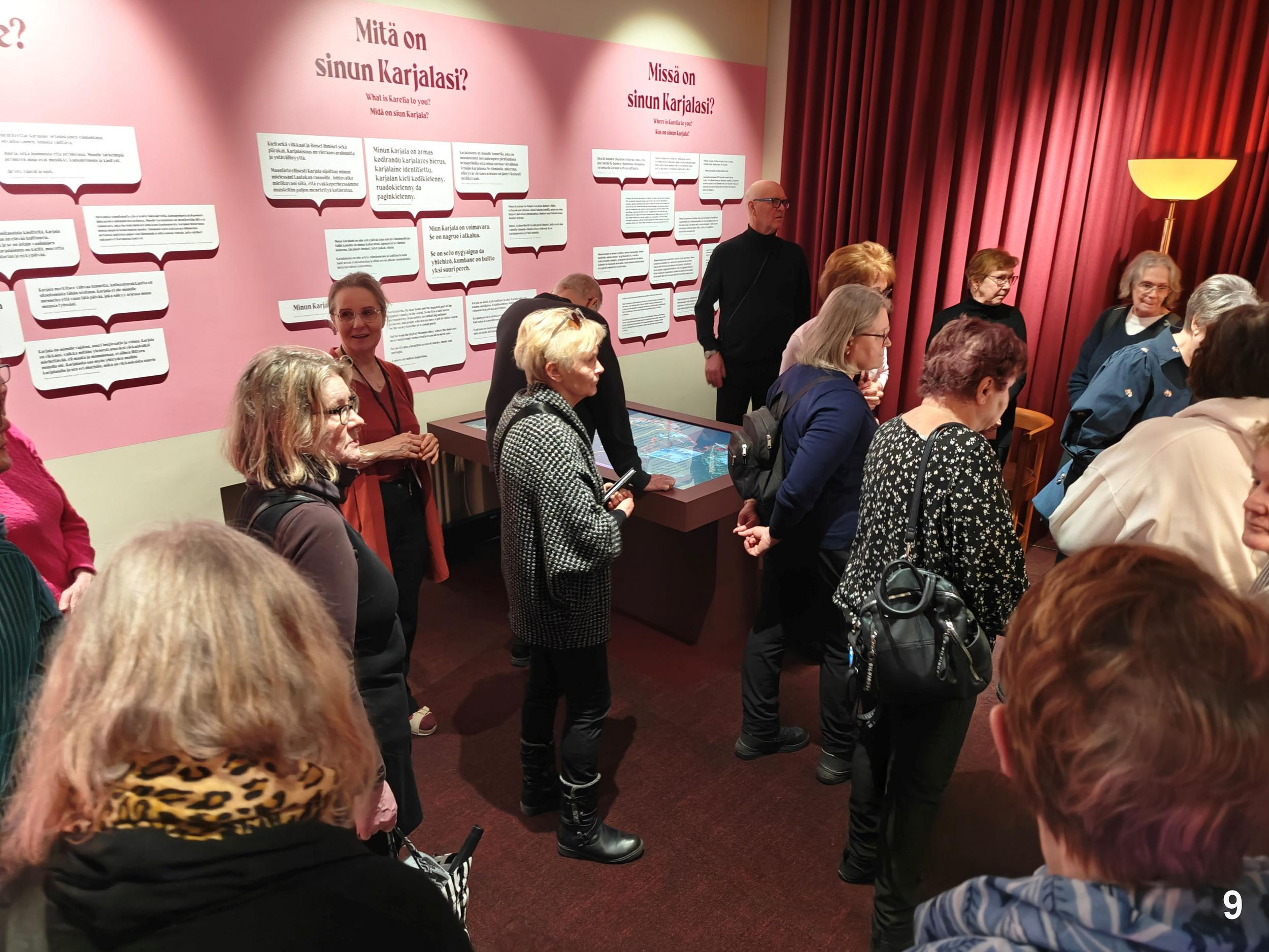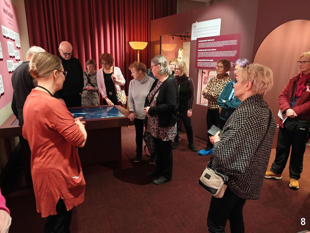 Tutustujia oli yhteensä 38. Oppaamme muistutti, että ELIEL ei ole perinteinen museo, jossa on pysyvä perusnäyttely, vaan toiminta perustuu teemanäyttelyihin. Oppaiden johdolla tutustuimme "Karjalan Neito – Laulumailta digikunnaille" -teemanäyttelyyn. Opas kävi läpi kattavan, selkeän ja innostavan esittelyn näyttelyn keskeisistä teemoista. Tältä pohjalta voi sitten itse kukin käydä uudestaan näyttelyssä ja perehtyä tarkemmin vaikka näyttelyn kattavaan tekstimateriaaliin. Kuinka usein teemanäyttelyt uusiutuvat, 5 … 10 vuoden välein vai jotakin muuta, siihen oppaalla ei ollut tarkempaa vastausta. Tuolikuva: Arille tuttu paikka, kaupunginhallituksen edellisen kokoushuoneen puheenjohtajan tuoli kaupungintalolta.