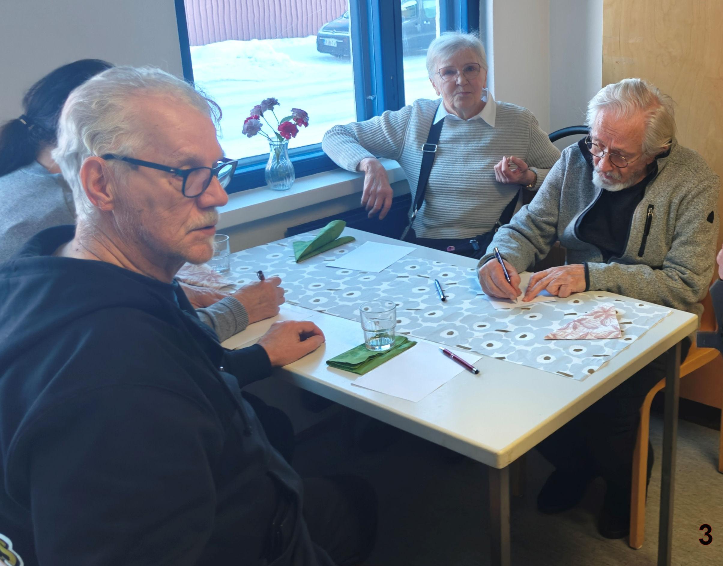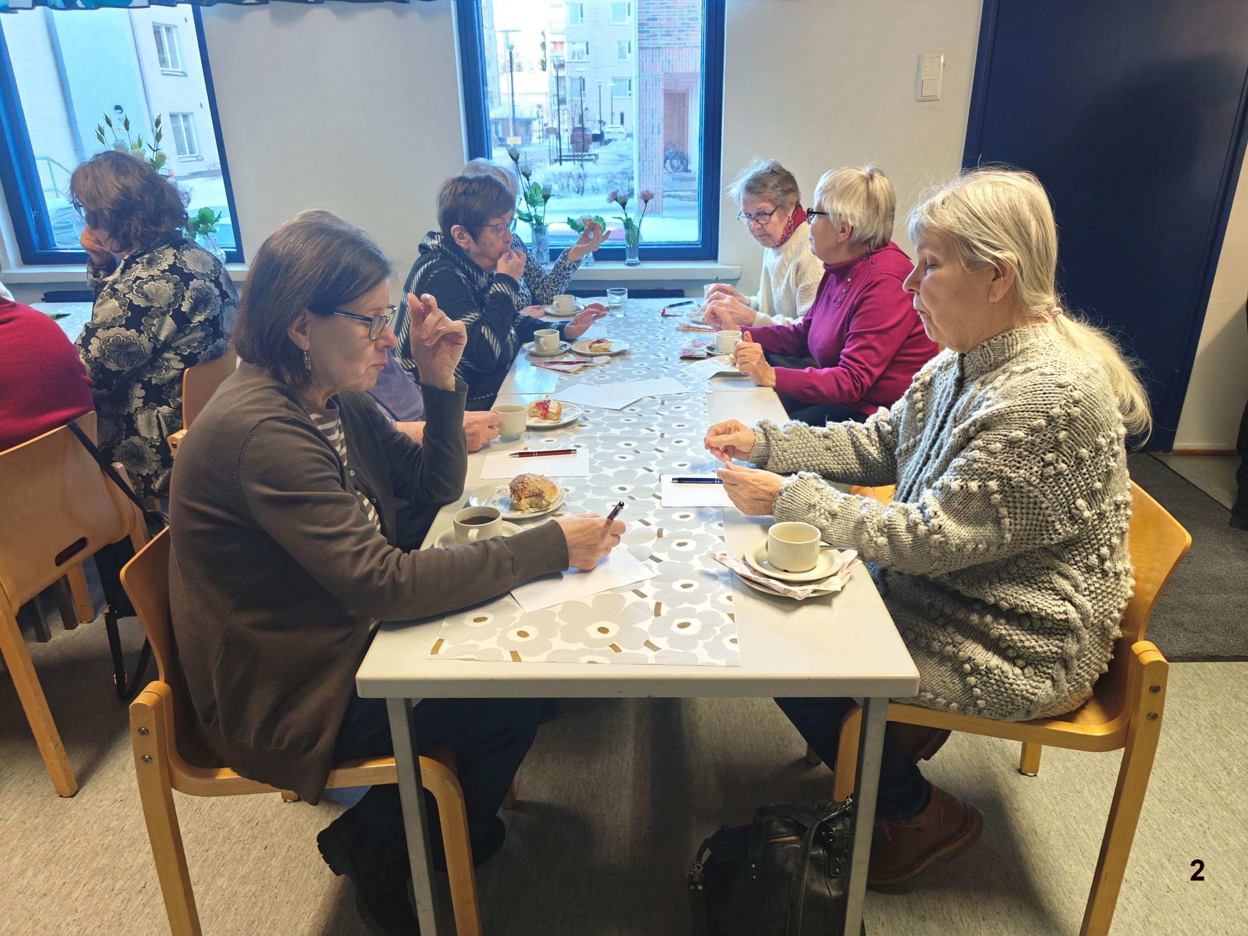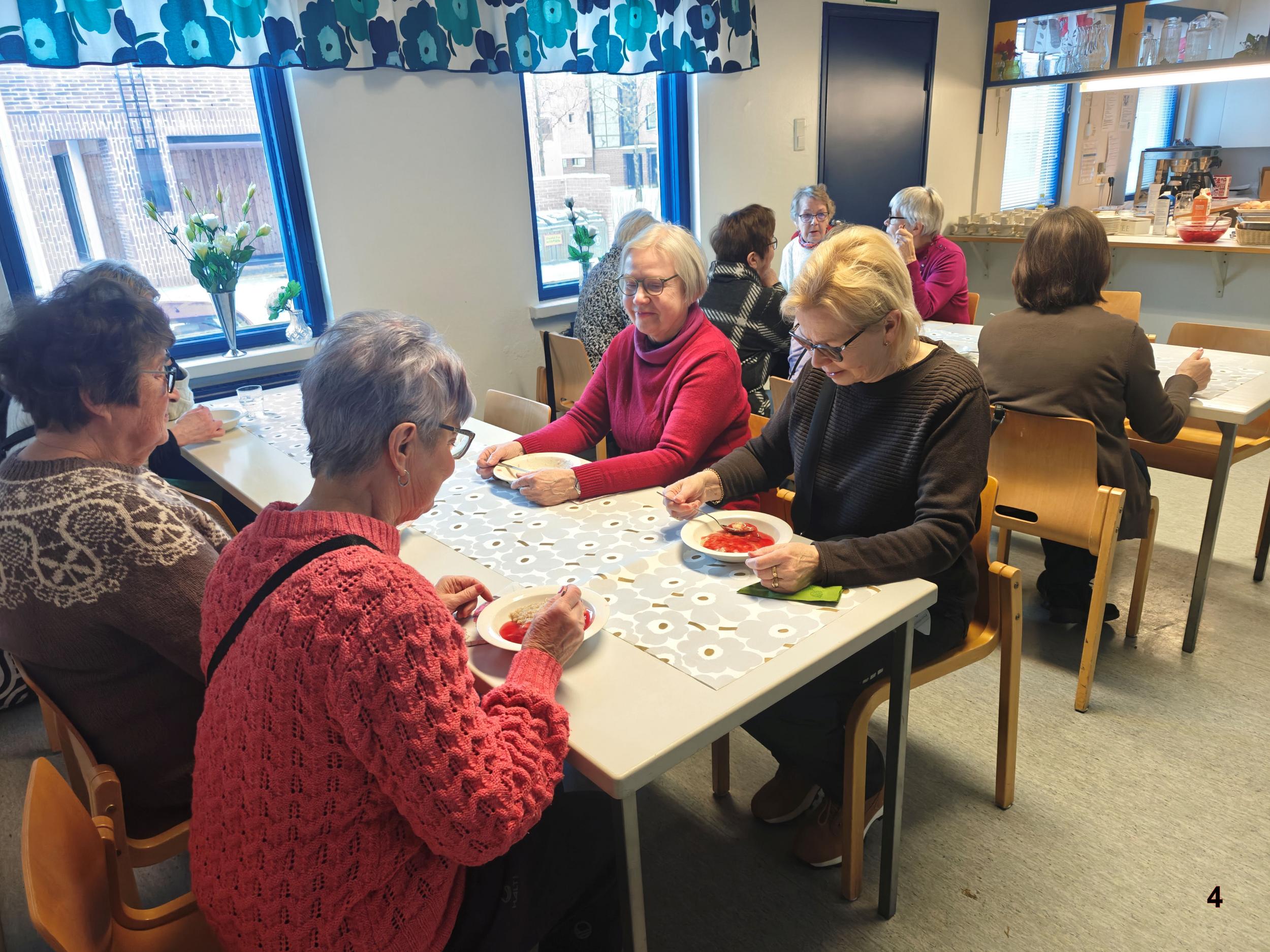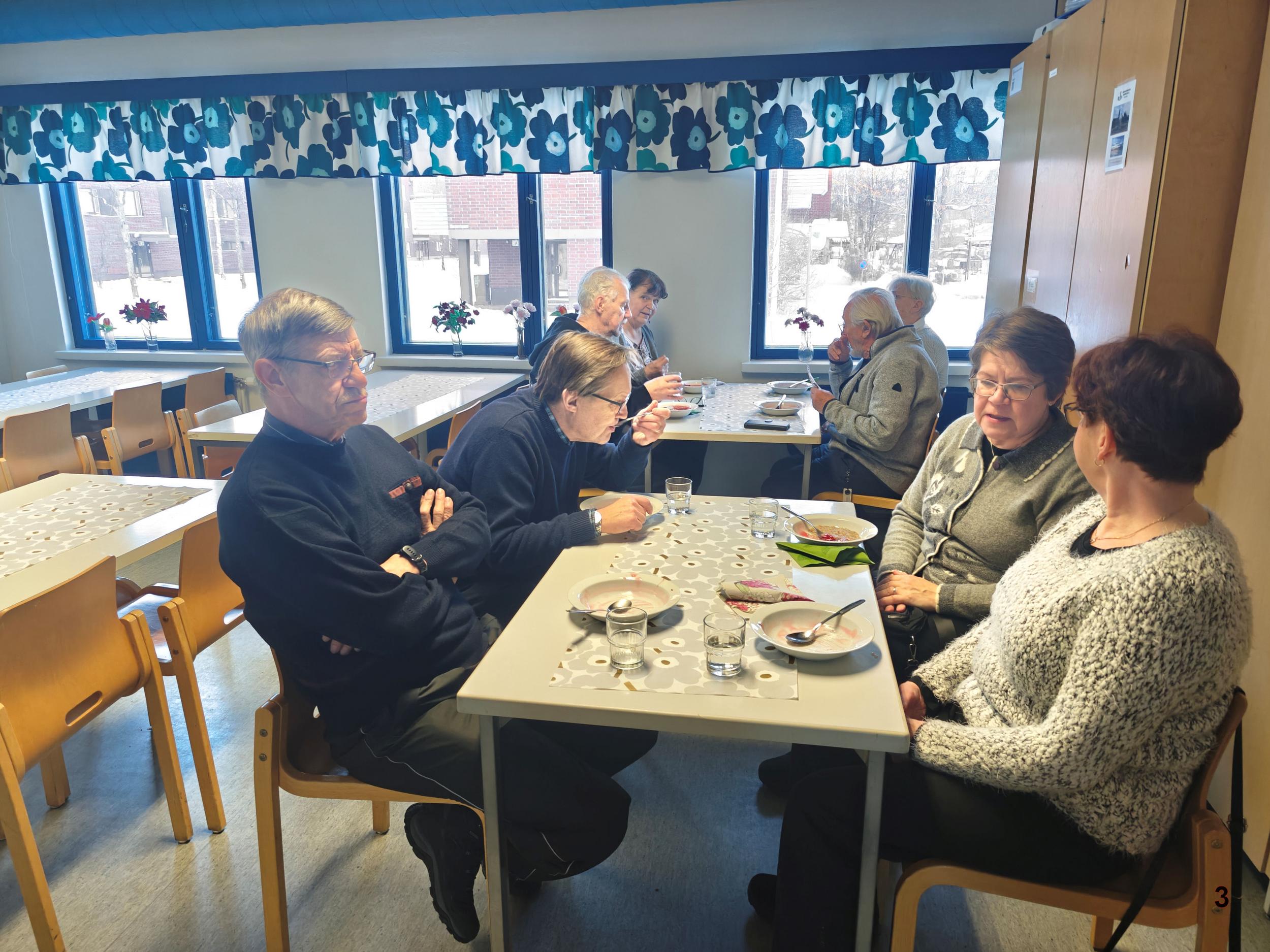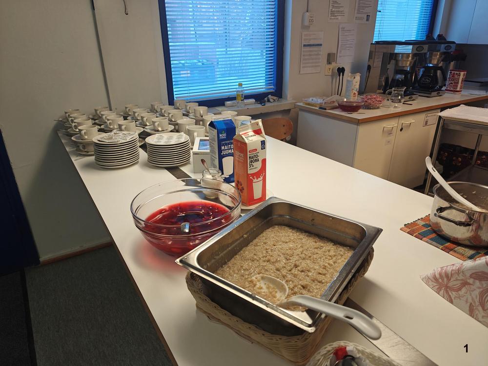 Jälleen herkullinen puuro odottaa syöjiään aidoilta lautasilta ja tietysti mansikkakiisselin kera. Puuro maistui ja emäntä kehotti santsaamaan. Ei puuro jäänyt ainoaksi herkuksi. Laskiaispullat maistuivat kahvin ja teen kanssa. Samalla hierottiin älynystyröitä tietokilpailussa.